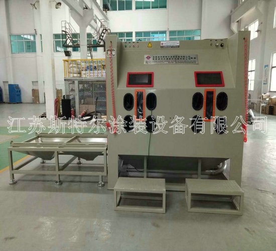 多工位手動噴砂機是我公司為上海麥鑫船舶科技四虎影视免费永久大全-四虎8848精品成人免费网站-四虎视频国产精品免费入口-四虎4hu永久免费网站影院量身定制的一款噴砂機,用于船舶渦輪增壓器、調速器的維修保養等,以提高產品表面處理的效率及質量而定制的噴砂機。該設備設計有3個操作工位,承重1噸的工作臺車架,方便對工件360度進行噴砂,該噴砂機可以實現多方位噴砂處理有效解決在噴砂加工期間的大工件無法翻面等問題,噴砂機工作室采用噴砂耐磨橡膠板雙層防護等特點提高工作倉的使用年限,照明裝置采用目前最好的LED噴砂機專用照明燈亮度及使用壽命都非常好。 除塵系統是由2濾筒和一臺2.2KW的風機組成,濾筒清洗由脈沖巡回系統反吹進行清洗。可一次性吹掃殘留在濾筒表面的微小顆粒。此脈沖控制儀采用微電腦自動化控制,只需簡單調試便可使用。噴砂室空間為4400mm*2000mm,配有4盞防爆節能燈,簡單方便的設計非常符合客戶的要求。