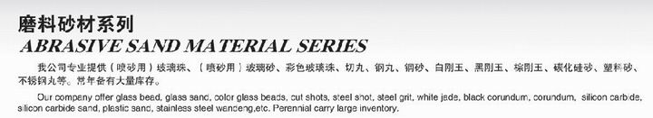 (噴砂用(yong))玻(bo)(bo)離紙珠、(噴砂用(yong))玻(bo)(bo)離紙砂、彩虹色(se)玻(bo)(bo)離紙珠、切丸、鋼丸、鋼砂、白剛(gang)玉(yu)、黑剛(gang)玉(yu)、棕剛(gang)玉(yu)、無定形碳硅砂、塑(su)膠砂、不(bu)銹鋼丸等。長時間常備大批量庫存(cun)管(guan)理。