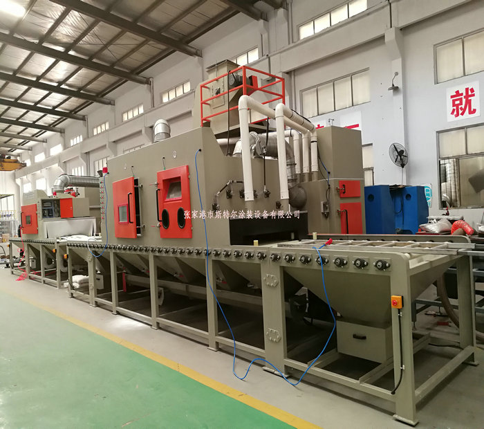 工人只操作噴砂機的控制系統和裝卸工件(或由上下工序的噴砂機的輸送機構輸入或者輸出),需要噴砂的工件放置在噴砂機的輸送機構上會自動運行經過吹氣倉后在通過噴砂工作倉進行表面噴砂處理,表面達到一定的粗糙度及達到除油,除污垢的最終效果,噴砂機加工結束后在經過除塵倉及吹氣倉,最終經過噴砂機的輸送機構運送出來。即噴砂加工結束。經過人工識別檢測后搬離,如工件上面有殘留的砂粒及粉塵時由人工使用吹氣槍清理結束后搬離。一般在噴砂機的一端出口會設計吹氣風刀,達到粉塵及砂料95%以上清除干凈。但是有可能殘留在死角及內孔里的砂料,在這種情況下只有靠人工清理,才可以全部清理結束。 生產加工順序圖內容如下: